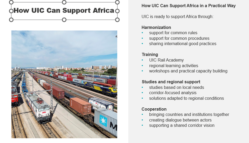 François Davenne, UIC Director General, opened the session, discussing the importance of safe international traffic between African countries, followed by Bertrand Minary, UIC Director of Freight and Passenger Departments, Coordinator of Middle East and Latin America Regions, who emphasised that rail freight must be integrated into global supply chains and highlighted UIC’s support for operations, safety, and digitalisation.