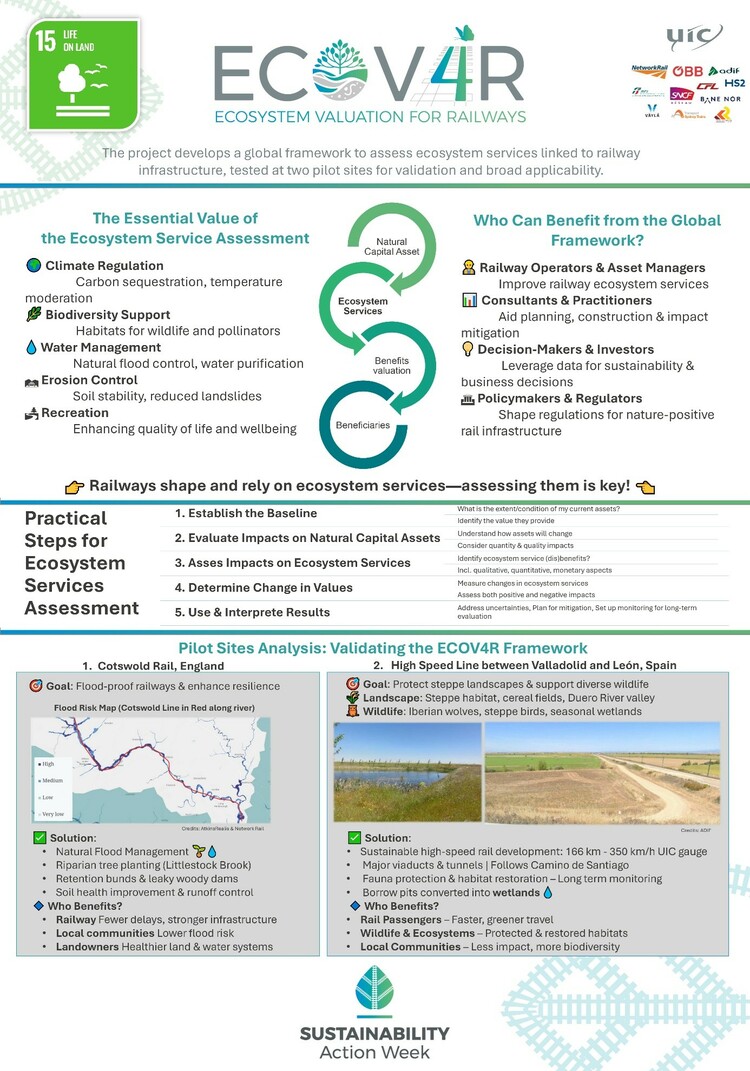 Railways both depend on and impact nature, yet ecosystem services are often underrepresented in infrastructure planning and asset management. The ECOV4R framework fills this gap by providing a structured, scalable methodology to assess, quantify, and, where possible, monetise the ecosystem services influenced by rail infrastructure and operations.